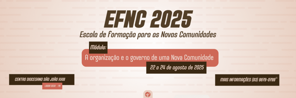 A Comunidade Remidos no Senhor convida todos os membros das novas comunidades a participarem do Módulo Presencial 2025 da Escola de Formação para Novas Comunidades. O encontro acontecerá de 22 a 24 de agosto de 2025, no Centro Diocesano (antigo Maristas), em Lagoa Seca – PB.