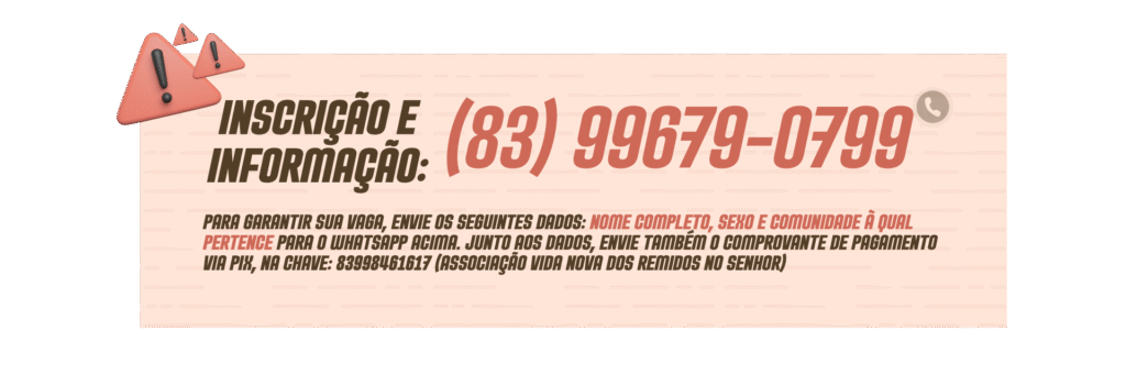 Junto aos dados, envie também o comprovante de pagamento via Pix, na chave: 83998461617 (Associação Vida Nova dos Remidos no Senhor)